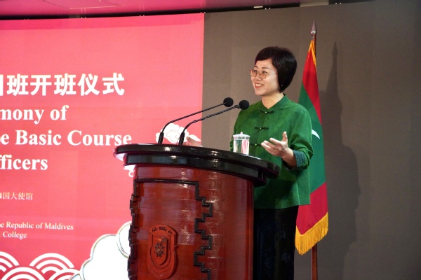 11月12日当地时间下午2点,马尔代夫警察局基础汉语培训班开班仪式在马尔代夫警察学院隆重举行。中国驻马尔代夫大使王立新、马尔代夫外交部代表巴萨玛(Bassama)、警察署署长阿里·舒加乌(Ali Shujau)、警察学院负责人(Rana Waheed)、维拉学院常务副校长纳吉布,以及警察局官员和马尔代夫维拉学院汉语中心(孔子学院)院长和教师等50多位嘉宾出席,共同见证这一重要时刻。