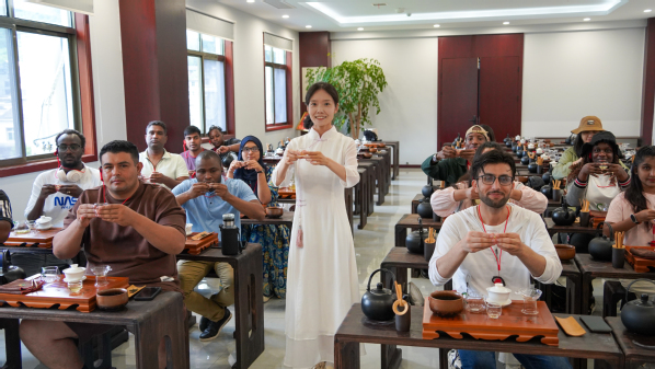 次日,留学生走进女娲凤凰茶业现代示范园,全程体验采茶与制茶工艺。在茶园学习手工采茶技巧后,他们在制茶工坊参与杀青、揉捻、烘干等传统工序,见证鲜叶到成品茶的蜕变。来自尼日利亚的纪墨感慨:“指尖触碰茶叶的瞬间,仿佛能感受到它们在阳光下生长的力量,这种与自然的连接是在实验室里感受不到的。”巴基斯坦留学生尤萨夫则在揉捻环节深有体会:“每一片茶叶里都藏着时间的重量,这让我想起祖父常说的‘手艺是用掌心温度焐出来的’。”