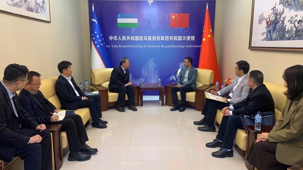 11月1日,代表团抵达乌兹别克斯坦首都塔什干,首先拜访中国驻乌兹别克斯坦大使馆。陈志坚书记向使馆临时代办、公使衔参赞王继伟、教育参赞孙长栋介绍了长安大学在交通运输、国土资源等领域的学科优势,以及中-乌交通学院的建设进展。王继伟代办充分肯定学校在乌开展汉语教学和本土化人才培养的成果,强调语言教育是促进中乌合作的重要桥梁,鼓励通过音像资料、数字化教学等手段,帮助乌兹学生深入理解中国科技与现代化发展理念。会谈后,代表团向使馆赠送由我校优秀校友伊力哈穆(Kasimov Ilkhom)翻译《中国先贤》双语著作,体现人文交流的深度互鉴。