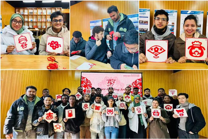 2 月 18 日,“剪纸艺术体验” 活动开展,尼泊尔学生石兰讲解剪纸的吉祥寓意,同学们亲手创作春字团花、年年有鱼等剪纸作品,在交流创作心得的过程中,深化了对剪纸文化内涵的理解,以剪纸寄托美好新年祝愿。