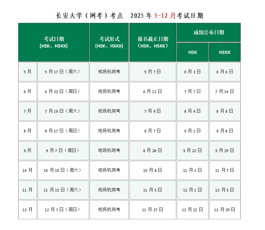 一、2025年HSK考试时间、报名时间以及成绩公布时间。