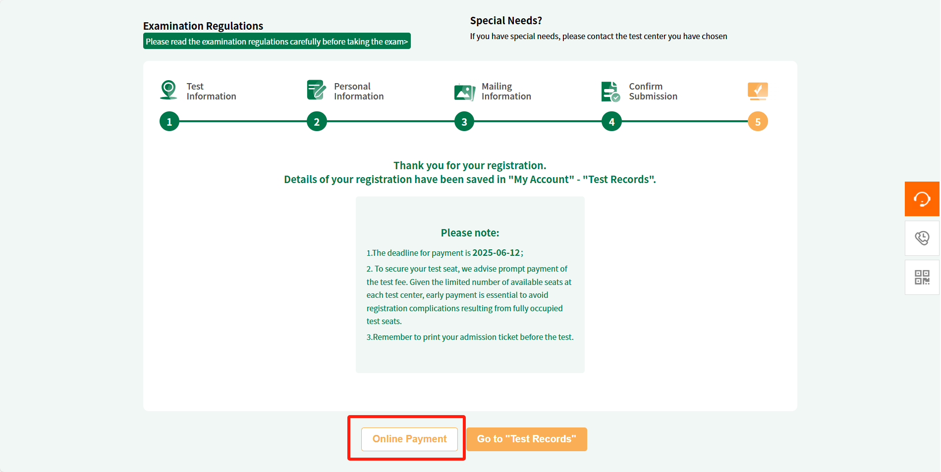 Important Notice: Once the online payment is completed, the exam registration becomes non-refundable and cannot be canceled.