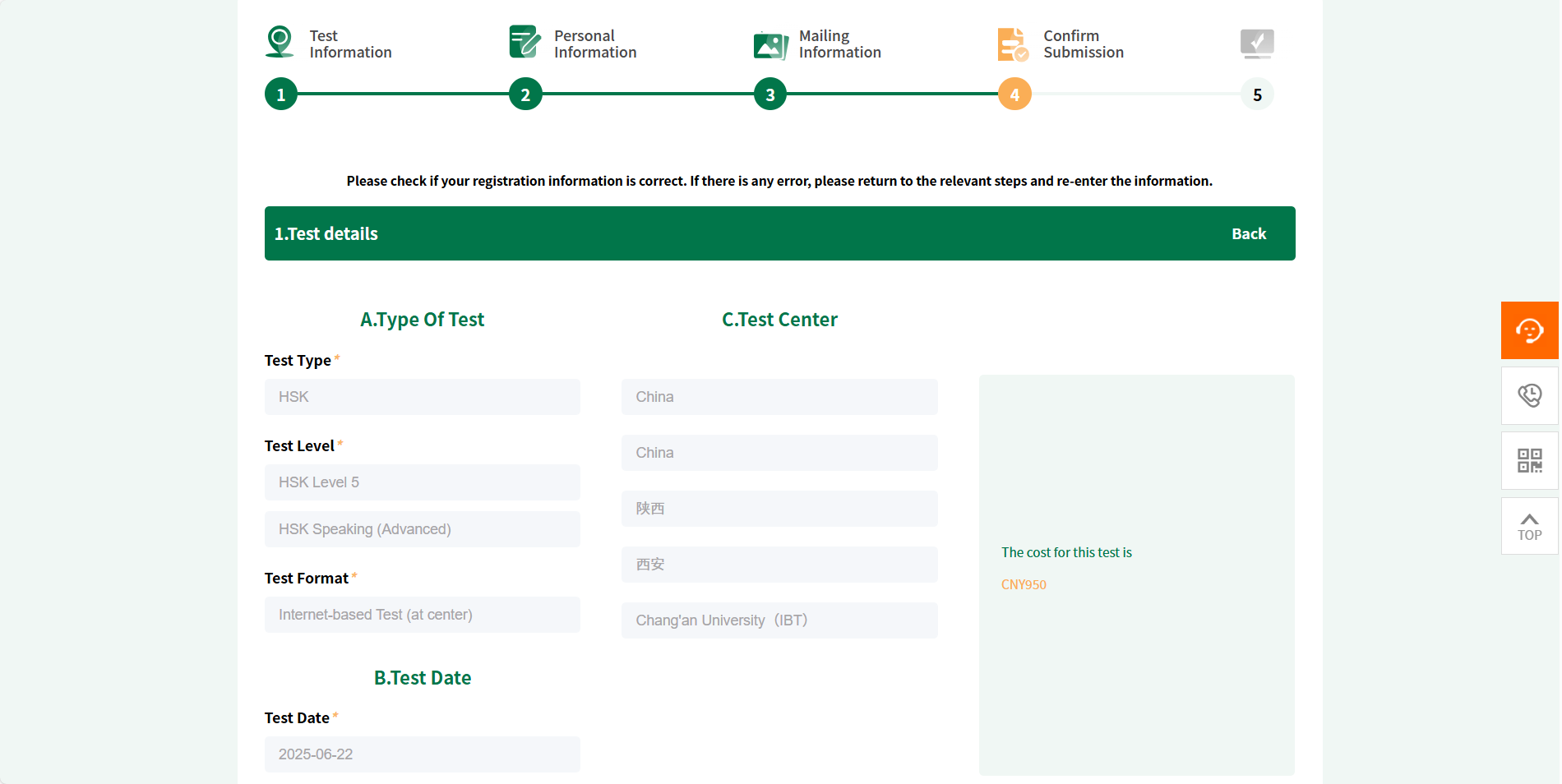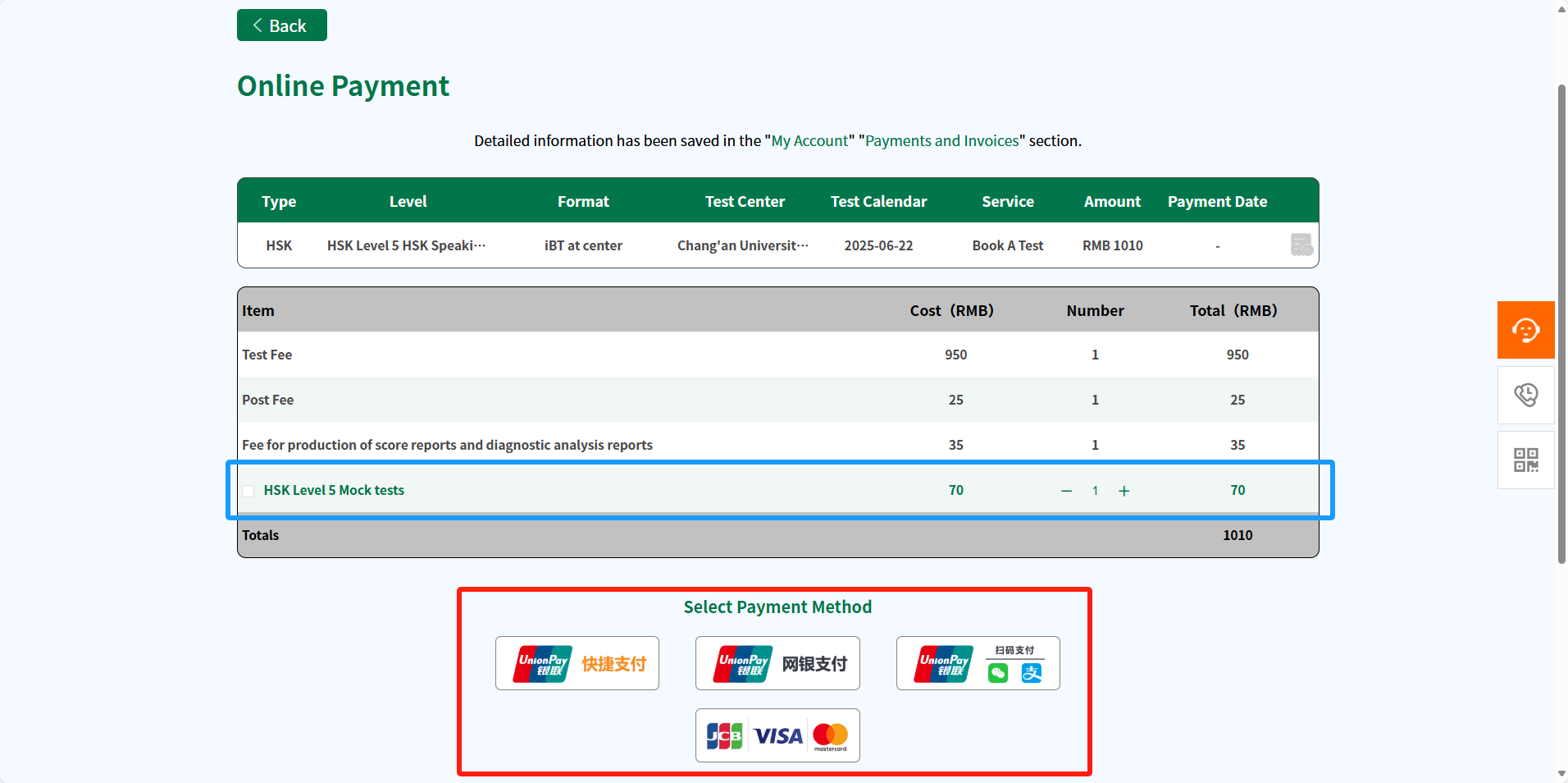 Proceed to the payment page and select your preferred payment method to complete the transaction online. Please note that a service fee will be applied to all payment methods. If you need to purchase the online HSK Mock tests provided by the website, you can tick the "√" when making the payment. Upon successful payment, a registration confirmation email will be automatically sent to the email address associated with your account.